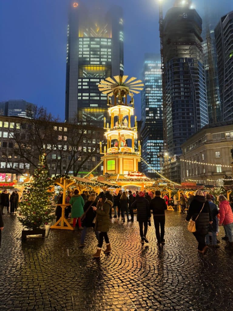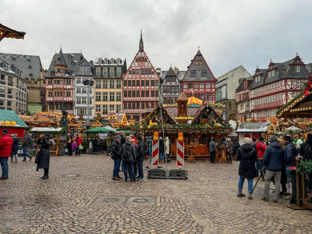After landing, we checked into a boutique hotel near the Römerberg, where the city’s main Christmas market sprawls across cobblestone squares framed by half-timbered houses. Frankfurt’s market is one of Germany’s oldest, and it feels wonderfully traditional — carousels, wooden stalls, and the smell of almonds roasting in sugar.